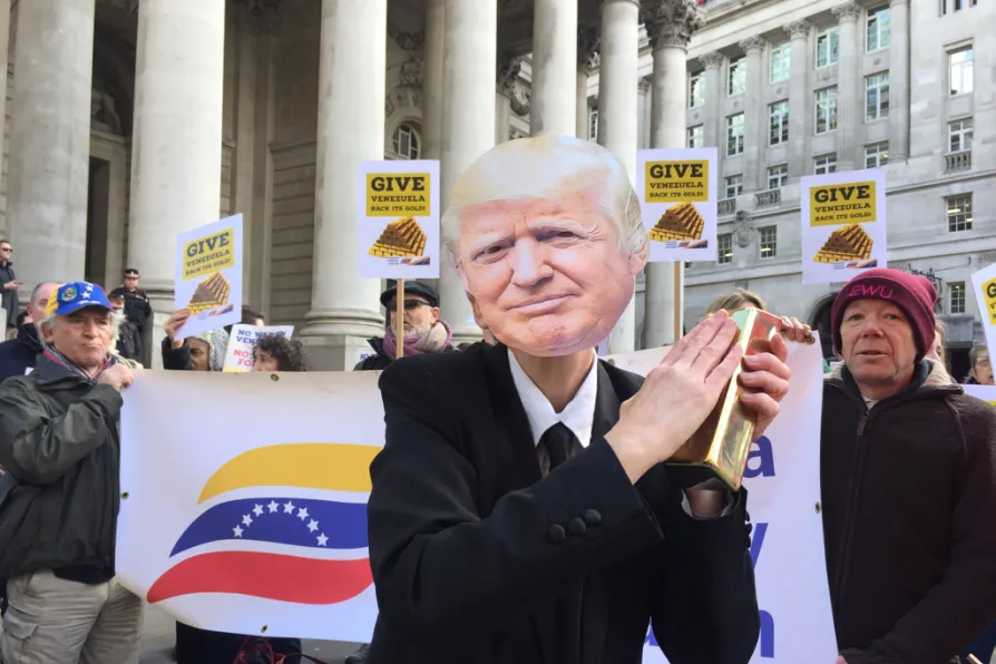 The crowd chanted “no blood for oil” and “BoE, you’ve been told, give Venezuela back its gold” as a masked figure of US President Donald Trump danced around with blocks of “gold.”