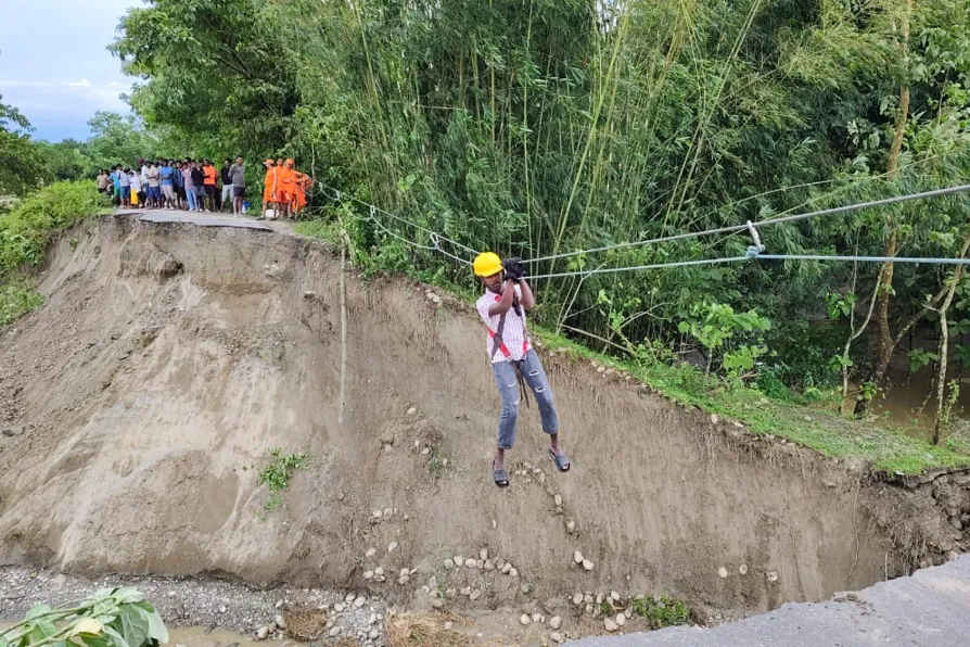 A person is evacuated with the help of a temporary zip line laid by the National Disaster Response Force (NDRF) following multiple landslides triggered by torrential rains near Jalpaiguri in the Indian state of West Bengal, October 5, 2025