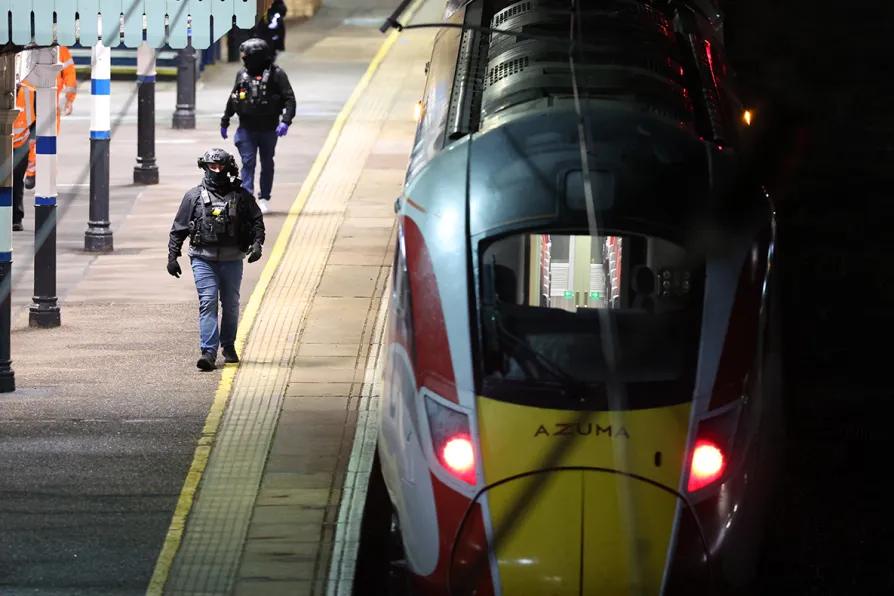 Police on the platform by the train at Huntingdon station in Cambridgeshire, after a number of people were stabbed, November 1, 2025