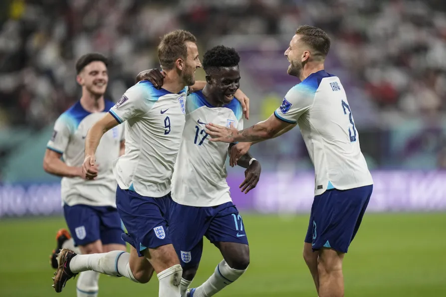 England's Bukayo Saka , second right, celebrates with teammates after scoring his side's fourth goal against Iran during the World Cup group B soccer match between England and Iran at the Khalifa International Stadium, in Doha, Qatar, Monday, Nov. 21, 2022.