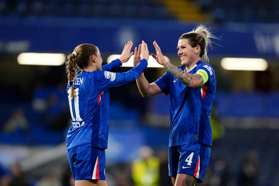 Chelsea's Guro Reiten (left) and Millie Bright (right) celebrate at the final whistle after the UEFA Women's Champions League match at Stamford Bridge, London. December 10, 2025