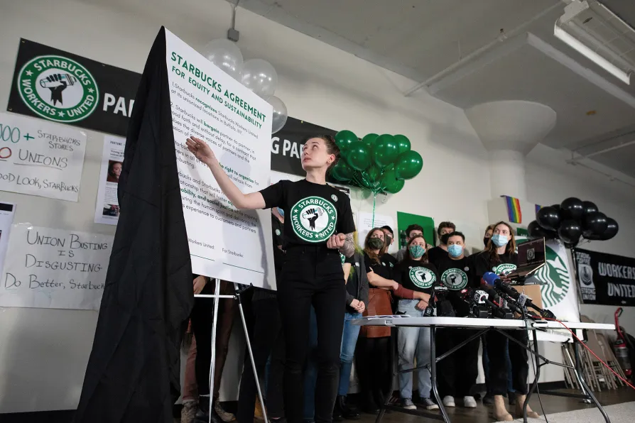 National and international labour umbrella organisations like the AFL-CIO signed on to the letter, with federation president Liz Schuler proclaiming categorically that “the labour movement stands with Starbucks baristas.”