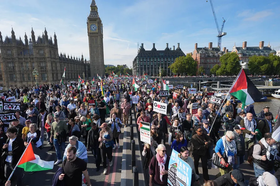 People on Westminster Bridge as they take part in a Palestine Solidarity Campaign march in central London, October 11, 2025