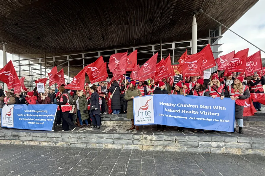 STRIKING health visitors marched on the Senedd today to press their demands for fair pay, demanding a meeting with the Welsh government.