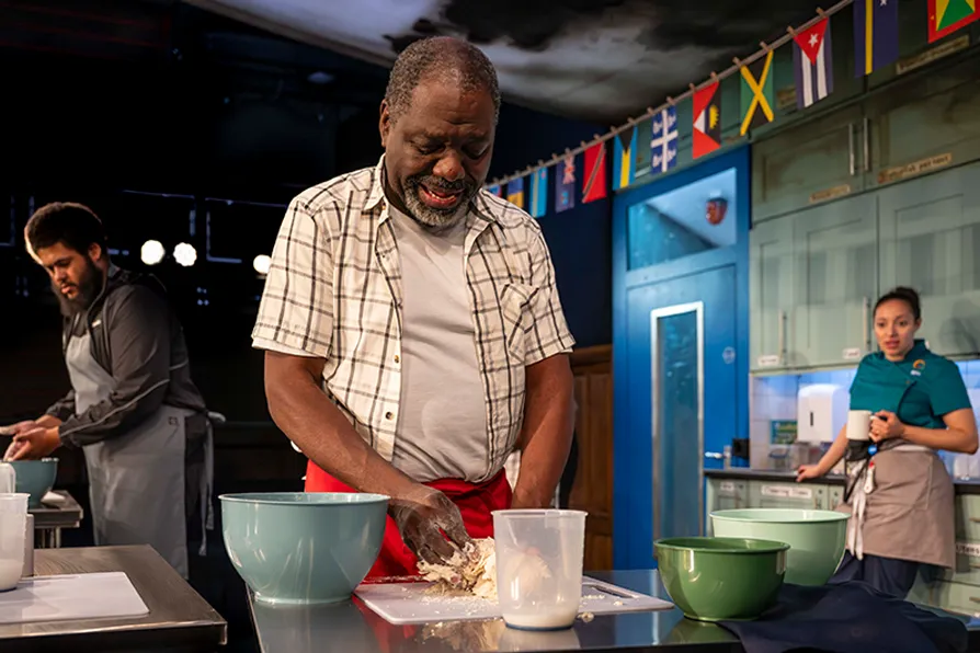 The eclectic, colourful flags of the post-colonial Caribbean hang over Clare Winfield’s clinical kitchen set, signalling resistance, but also the weight of history that the characters are still having to bear.