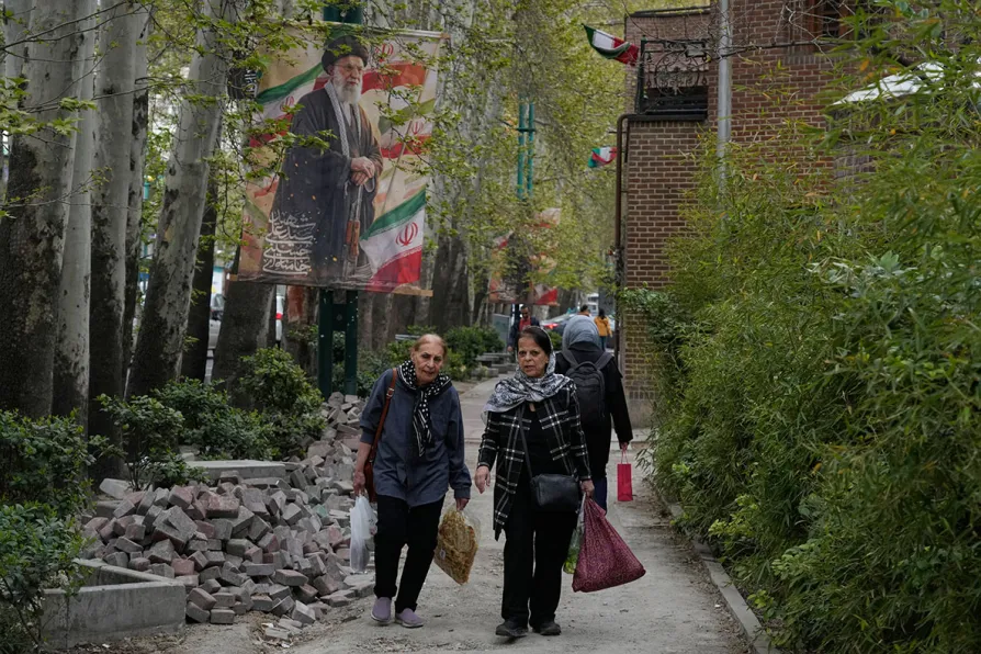 Women walk past a banner depicting the late Iranian Supreme Leader Ayatollah Ali Khamenei, who was killed in the U.S. and Israel strikes on Feb. 28, in northern Tehran, Iran, April 12, 2026