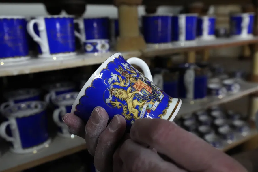 A worker checks the quality of official chinaware at a pottery factory in Stoke-on-Trent where the official Coronation chinaware is produced on behalf of Royal Collection Trust, April 13, 2023