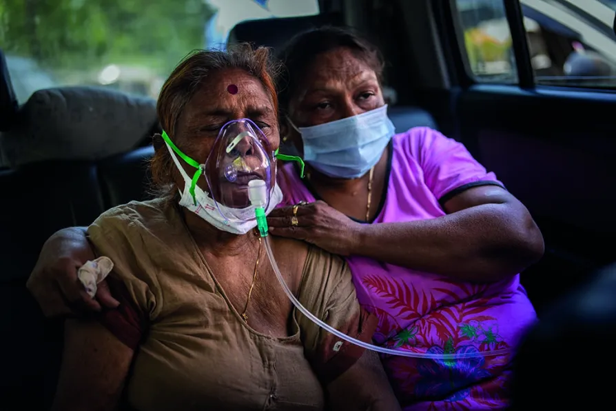 An Indian woman breathes using an oxygen mask as she waits for treatment. India with South Africa began the push to waive patents on Covid treatments last autumn – which is being blocked by Britain and the EU