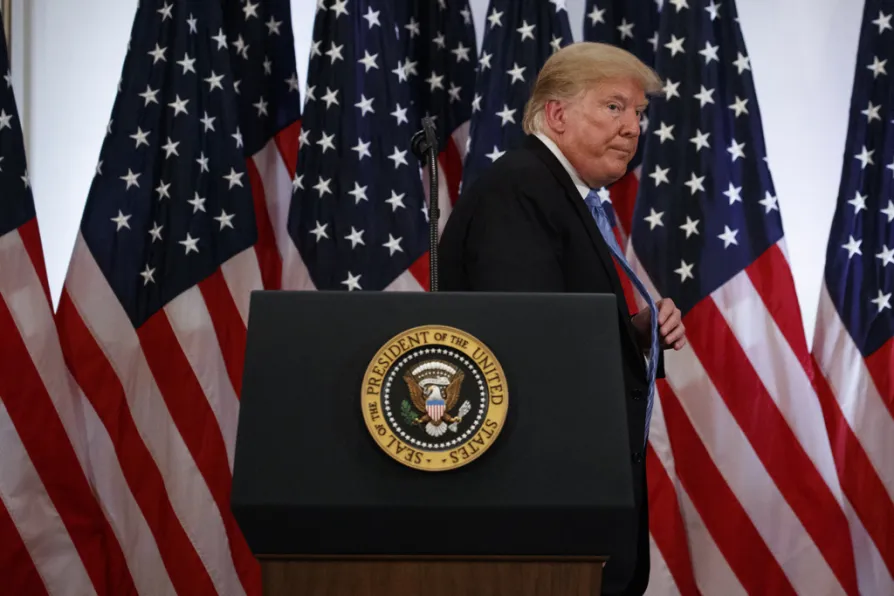 President Donald Trump walks from the podium at the end of a news conference at the Lotte New York Palace hotel during the United Nations General Assembly yesterday