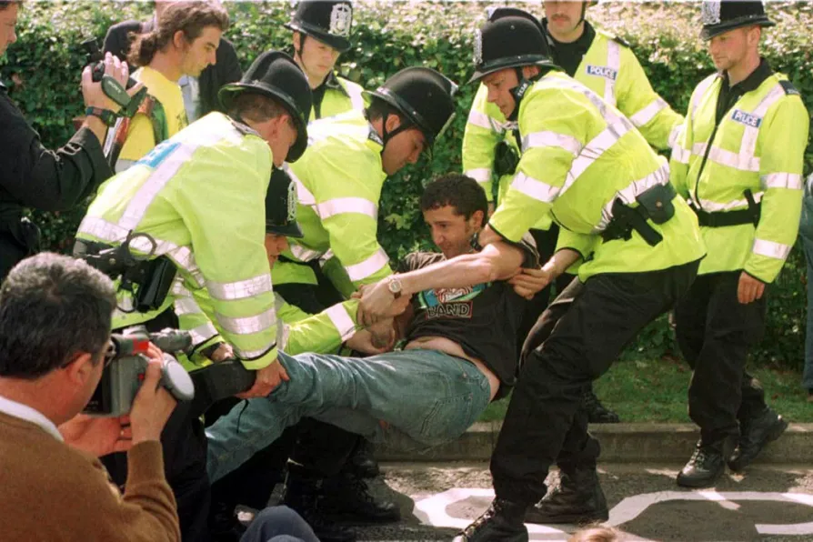 Police restrain Campaign Against Arms Trade protesters at the entrance to Farnborough airfield, hosting Britain's biggest annual arms fair, September 1, 1997