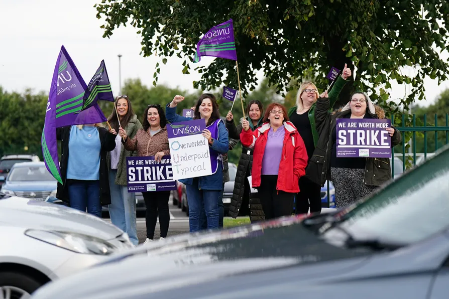 School support workers, who are members of Unison, Unite and GMB Scotland, on the picket line at Portobello High School in Edinburgh, September 26, 2023