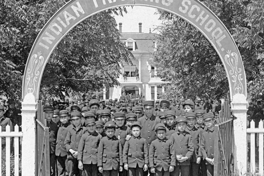 DEHUMANISING: Pupils standing at the entrance of the Chemawa Indian Training School in Salem, Oregon [Oregon Historical Society Research Library/Creative Commons]