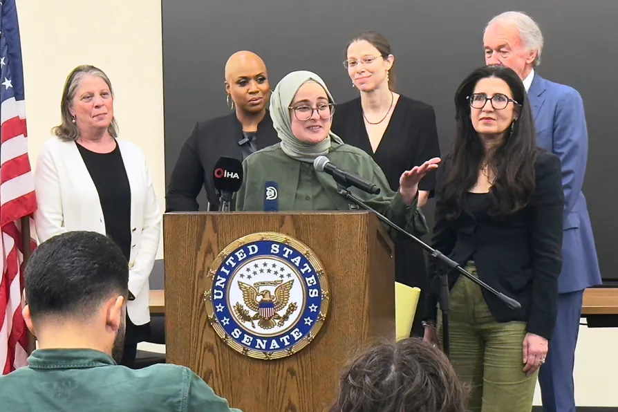 Tufts University student from Turkey, Rumeysa Ozturk, who was arrested by immigration agents while walking along a street in a Boston suburb, talks to reporters on arriving back in Boston, May 10, 2025