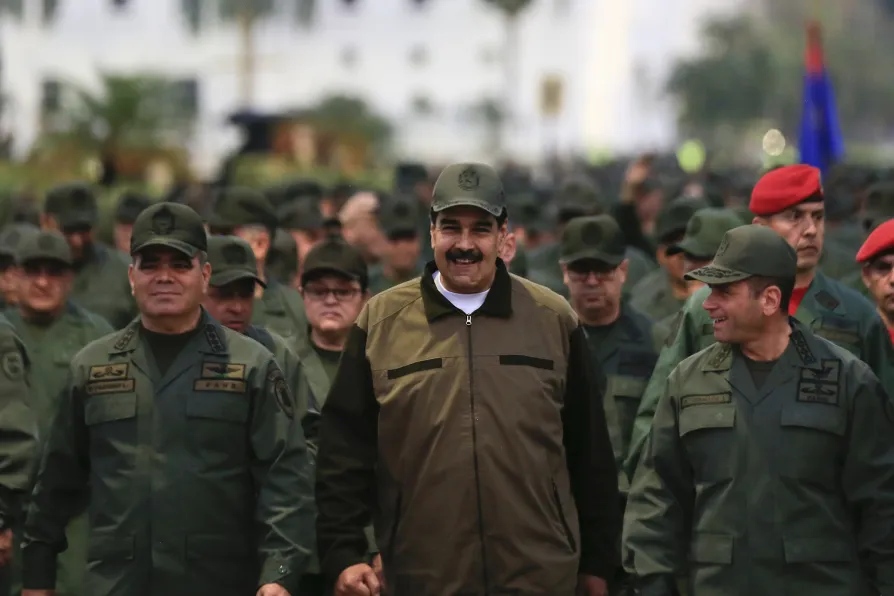 Venezuela's President Nicolas Maduro (centre) accompanied by Defence Minister Gen Vladimir Padrino Lopez (left) and the Strategies Operations Commander, Adm Remigio Ceballos, arrive for a meeting with the troops at Fort Tiuna in Caracas, Venezuela