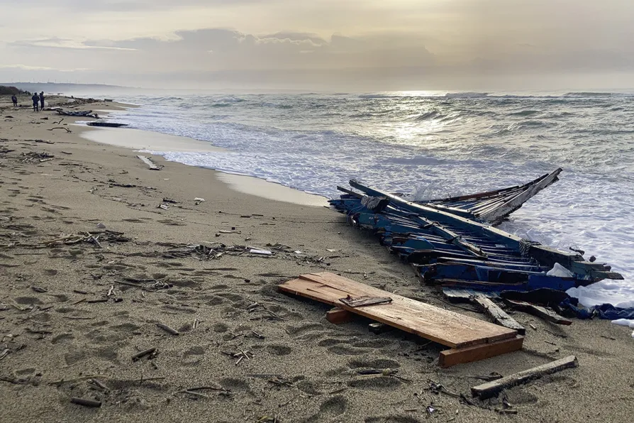 A view of part of the wreckage of a capsized boat that was washed ashore at a beach near Cutro, southern Italy, on February 27, 2023