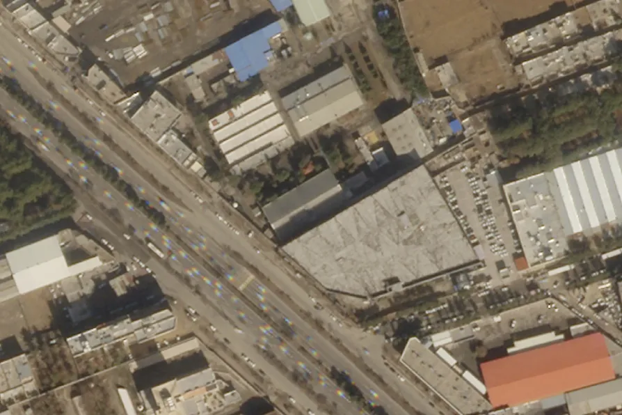 This satellite image from Planet Labs PBC shows damage on the roof of an Iranian military workshop, center, after a drone attack in Isfahan, Iran, Thursday, Feb. 2, 2023.