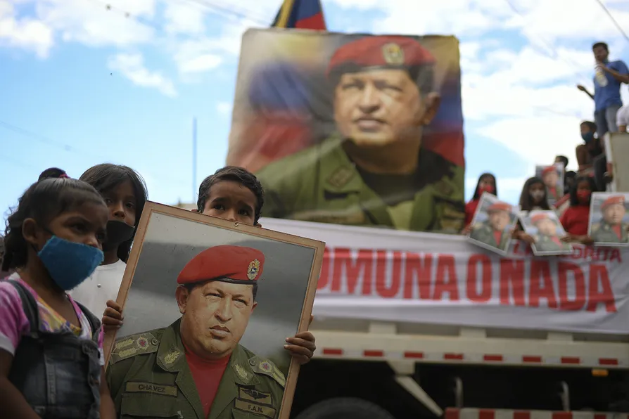 Children hold a portrait of the late President Hugo Chavez during an event celebrating the anniversary of his 1992 failed attempt to overthrow President Carlos Andres Perez at the 23 de Enero neighborhood in Caracas, Venezuela, Thursday, February 4