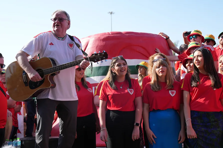 Welsh singer Dafydd Iwan performs with a choir at the Corniche Walk Park, Qatar, ahead of Wales' second Group B games at the Fifa World Cup 2022, November 25, 2022