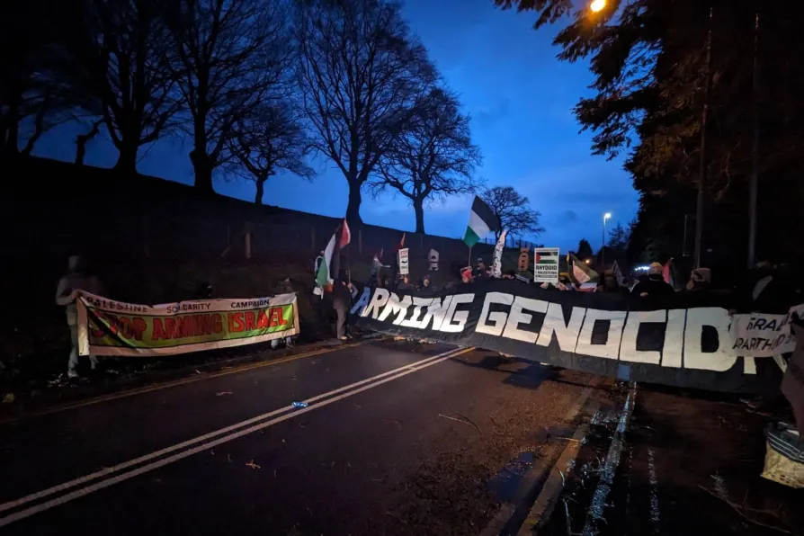 Wales Peace Coalition campaigners held banners saying “stop arming genocide” and “UK weapons kill” as they blockaded BAE Systems’s factory in Glascoed, near Pontypool.