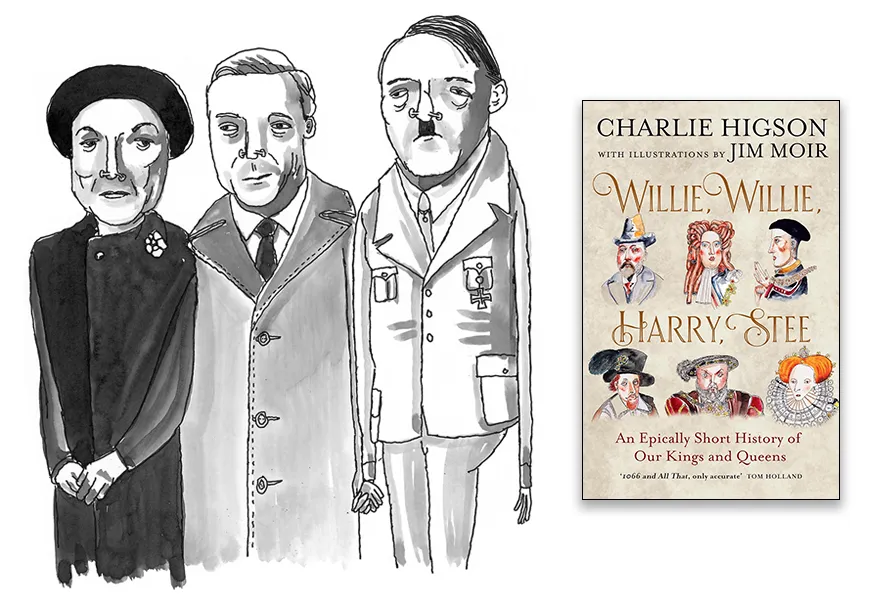 Moir provides idiosyncratic drawings to illustrate such situations, alongside caricatures and cartoons that occasionally contain deliberately incongruent elements – such as the portrayal of Henry II on pilgrimage to Canterbury with modern-day polyester trousers and Cuban-heeled boots. Others, including a deadpan portrait of “Edward and Mrs Simpson and Herr Hitler” say a lot without attempting to portray too much.