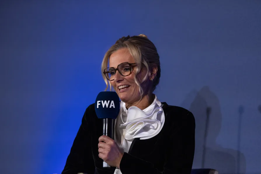 England women's football head coach Sarina Wiegman talking during a Q&A on stage during FWA's Tribute Night at the Landmark Hotel, London, January 25, 2026