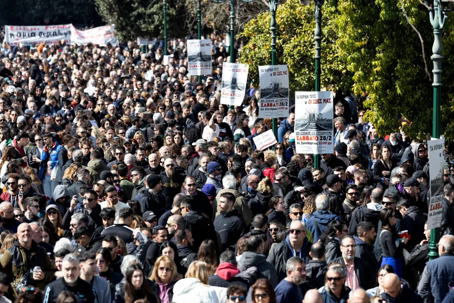 People attend a rally marking a three-year anniversary of a train collision where 57 people were killed on Feb. 2023, at central Syntagma square, in Athens, Greece, February 28, 2026
