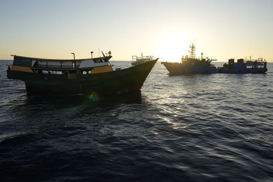 Philippine resupply vessel Unaizah May 4 is blocked by suspected Chinese militia ships as they tried to enter the Second Thomas Shoal, locally known as Ayungin Shoal, in the disputed South China Sea, March 5, 2024