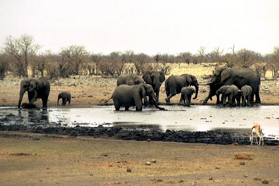 Elephants drink at a waterhole in Etosha National Park in Namibia on September 23, 2004