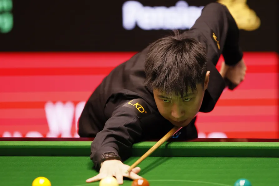 Zhao Xintong during his match against Liam Highfield (not pictured) on day one of the Halo World Snooker Championship 2026 at the Crucible Theatre, Sheffield, April 18, 2026