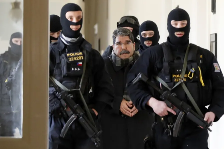 Police escort former PYD co-chair Salih Muslim to court this morning in Prague