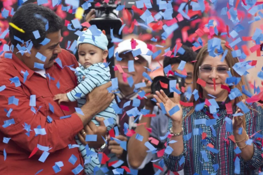 Venezuela's President Nicolas Maduro holds a baby as first lady Cilia Flores (right) applauds during a campaign rally in the parish of Catia in Caracas, Venezuela, last Friday